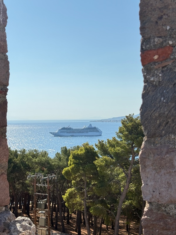 We went on shore at Mitilini, more commonly known as Lesbos. It is the second-largest of the Greek Islands, the largest being Crete. It was a very warm day which started with Tim completing one thing necessary to all our holidays - he lost his hat - not because he misplaced it but because the wind blew it out a window at the fortress!