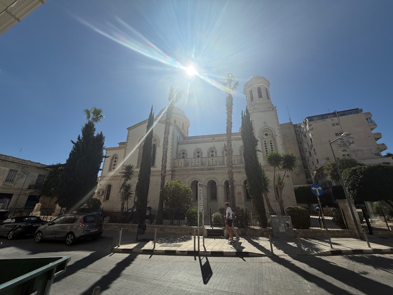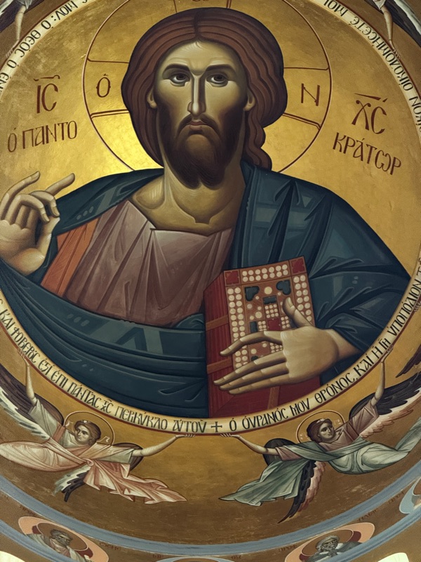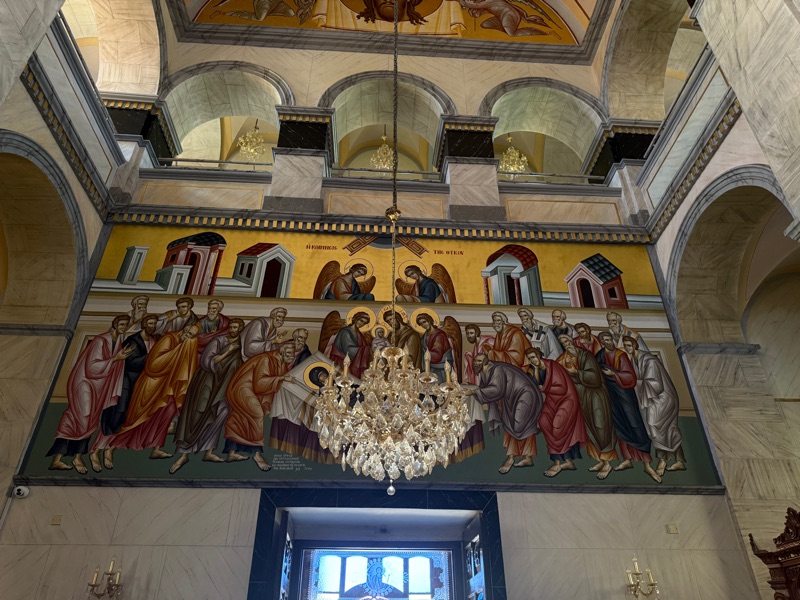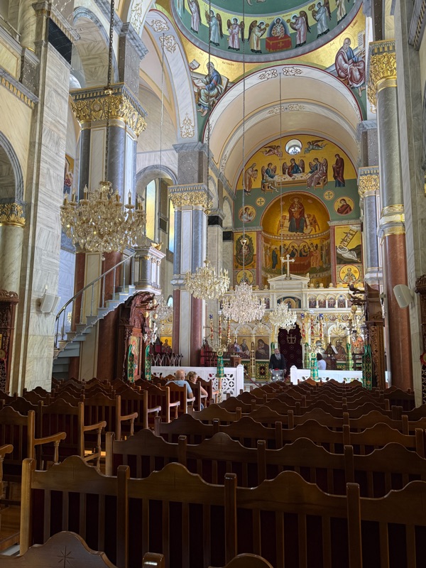 Not many shops were open but we wandered the streets seeking the shade. We found a lovely Orthodox Church with wonderful mosaics and a detailed ceiling.