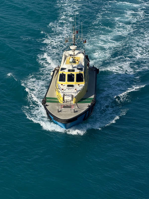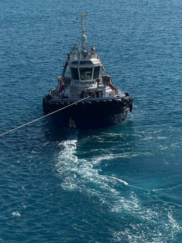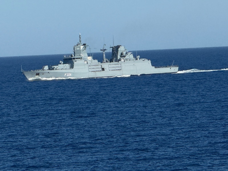 We left late in the afternoon. The opening to the harbour is very narrow so we were closely supervised. One tug actually attached a line and pulled our stern away from the dock. Some harbours insist that a local pilot actually boards the ship to navigate out of the harbour. There was a Greek naval vessel in the harbour.