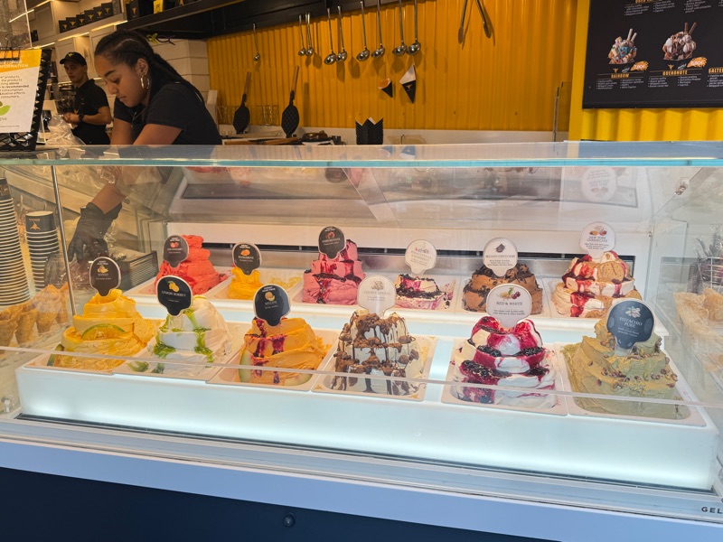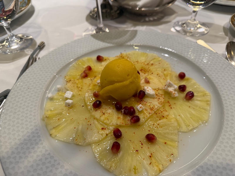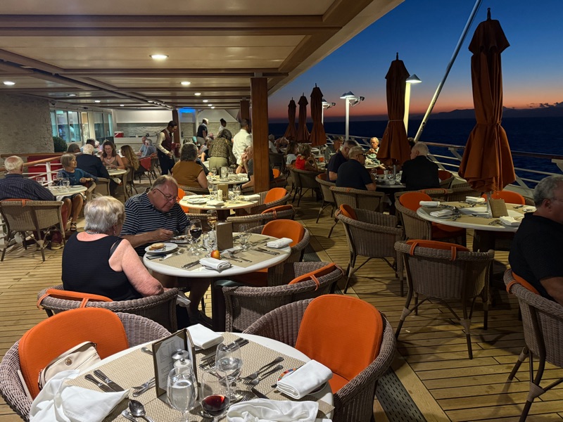 A word about the dining room - there are several. The Terrace Cafe which has buffets morning, noon and evening. After two days Marija gave up and took to the small cafe out by the pool where she enjoyed a latte, lots of fruit and maybe a croissant. Tim usually opted for an omelet, coffee, fruit, bacon etc. At lunch the Terrance Cafe featured sushi, hot entrees, soup, cold cuts, cheese, a daily power bowl option and lots more. There were 6 varieties of ice cream and gelato on a daily basis as well as desserts which were irresistible.