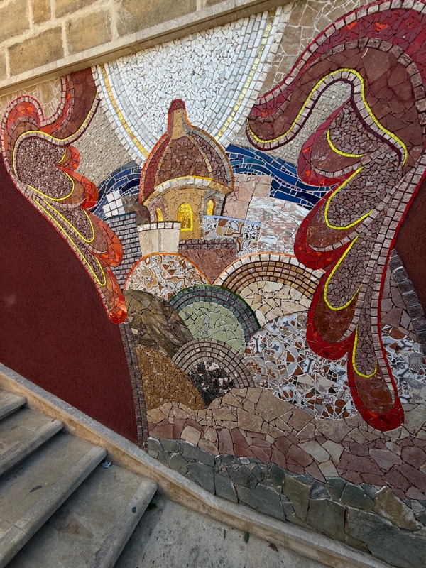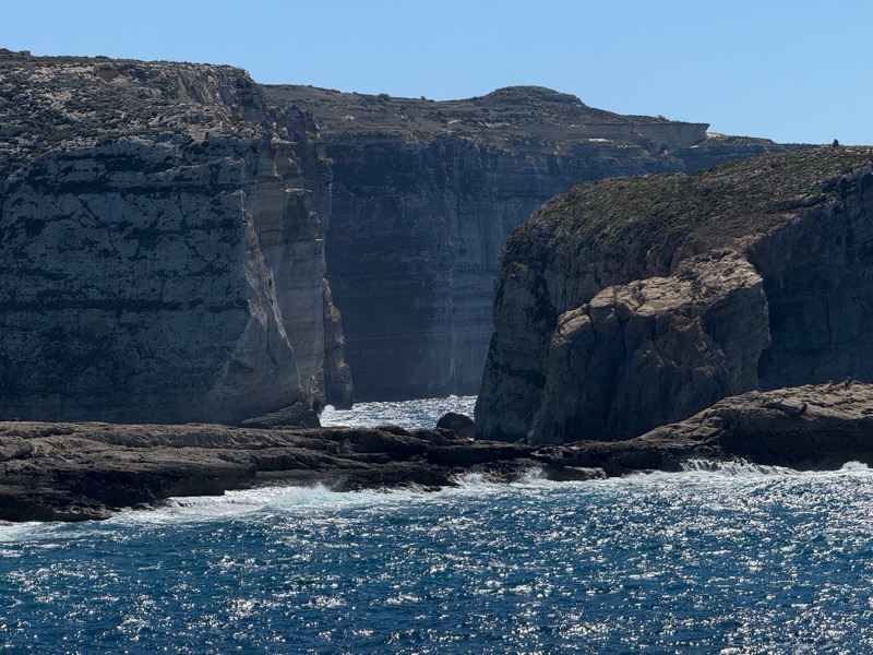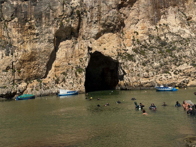 Gozo is much slower paced. There are lots of little village with very narrow streets. As a result, the buses had to stop and wait for cars and, in the odd case that two buses met, one would need to back up to let the other one pass. Our first stop was at a classical Catholic Cathedral which had been the site of a miracle. Unfortunately, the building was not open but there were several stunning mosaics outside. (The temperature was about +40! Very hot.) We then drove through the countryside and stopped at the sea. The place had stunning views and is known for its snorkelling. The walking was fairly treacherous so we did not venture far.