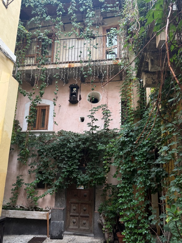 Well, that evening was a great drama and some stress. We were very tired so we went off to bed. In the morning light we looked over our lodgings. I know most of you have heard of Shabby Chic. Well this place was shabby without the chic! No doubt the designer was very clever but there were a lot of deficiencies. If you wish to have a look at the property please go to the web site for Palazzu Stidda. When Tim booked the rooms he noticed that it had a rating of 8.6. However, when we reexamined the photos we found that either they had been photoshopped or the place has really gone downhill. First, however, we will mention the positives. It was very central. The bed was comfy. There was free laundry available. It had a nifty, electric Bialetti for making espresso and there was a fridge. Situated in a very old building with jasmine clinging to it, the place was quaint with a small balcony where we could enjoy our breakfast together.