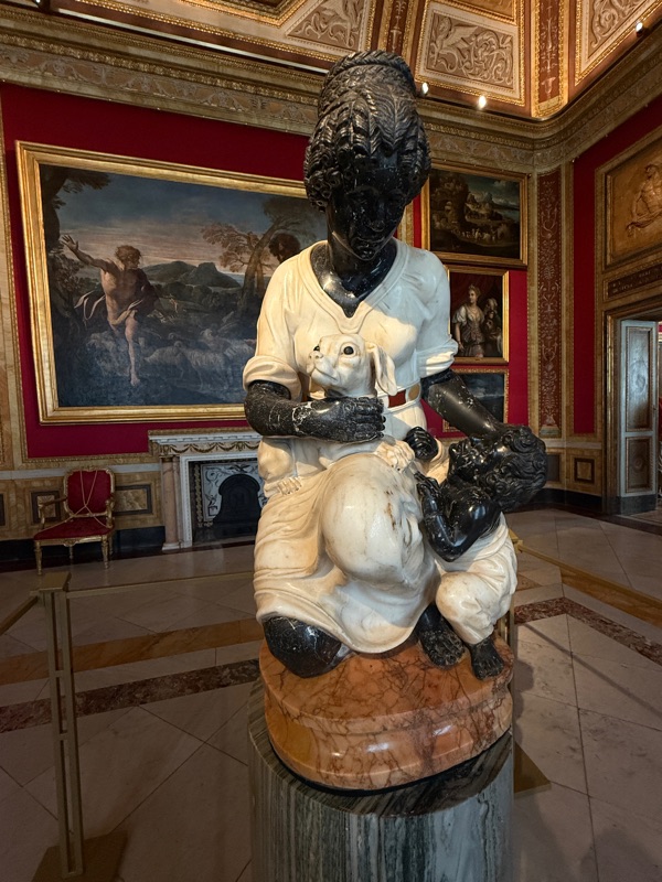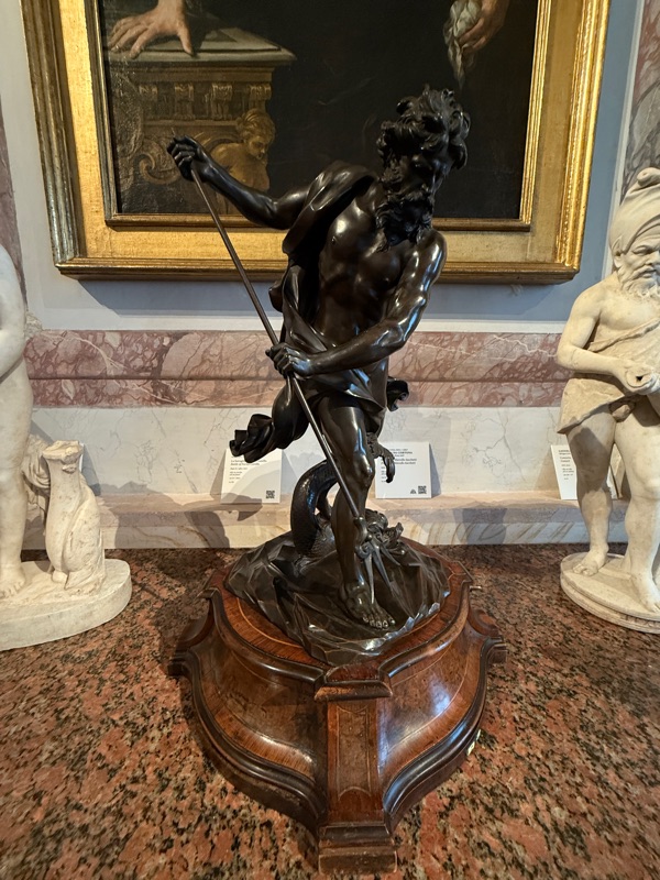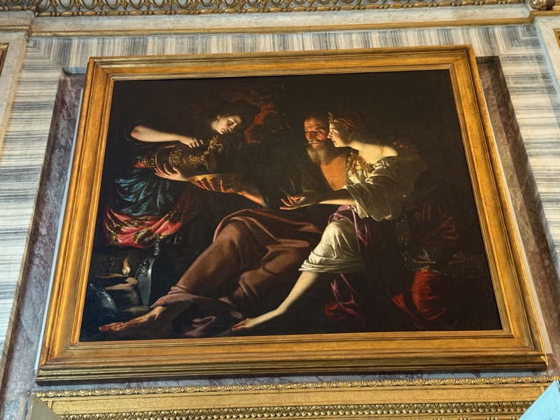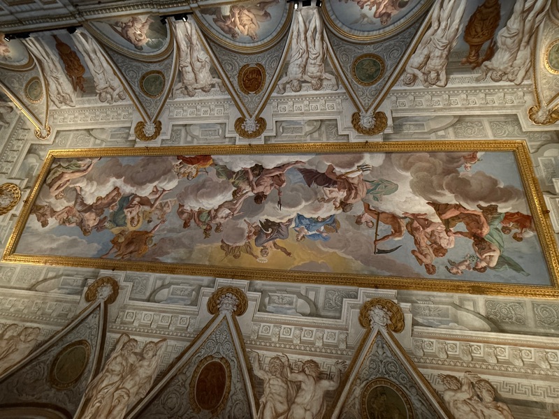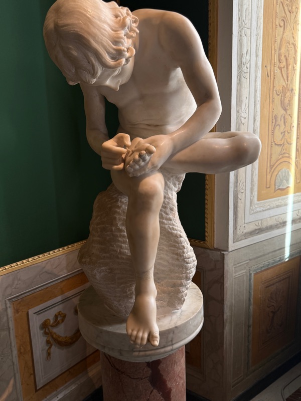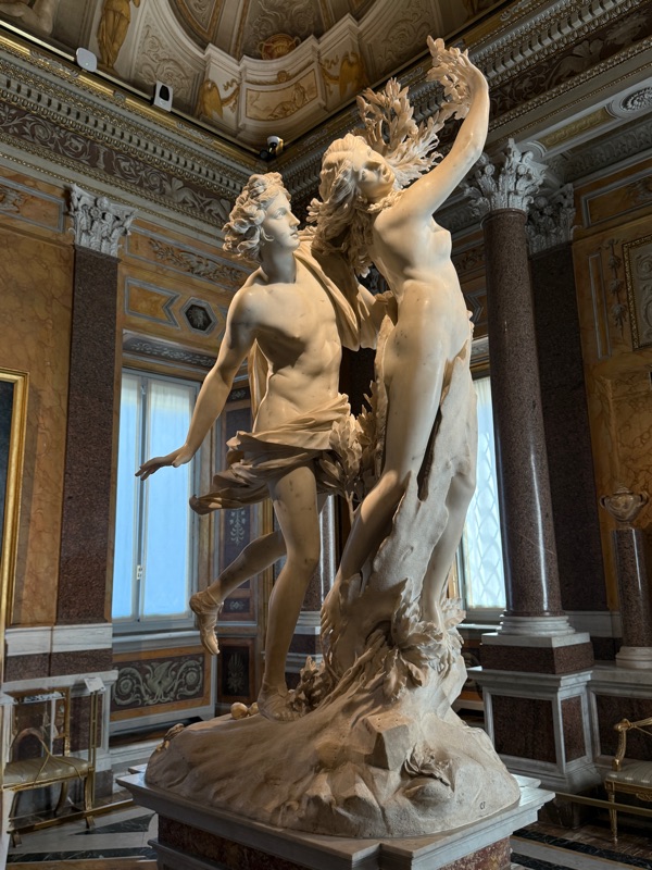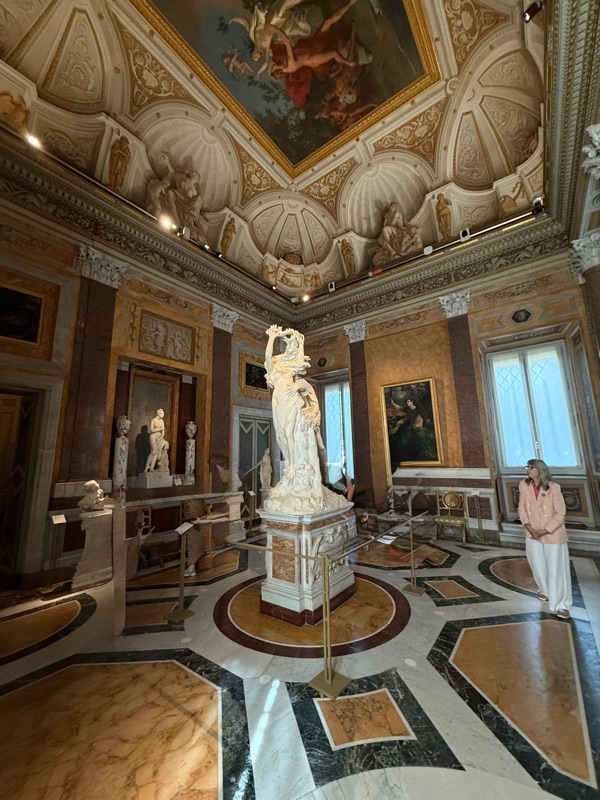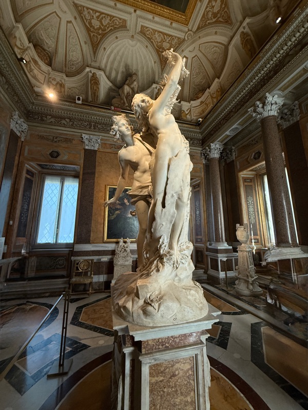 Words cannot describe the gallery. There is decoration from floor to ceiling - literally, Painted murals, marble floors and gold gild. Then there are the paintings and sculptures. Pope Paul v’s nephew, Scipione Caffarelli had the palazzo built. He recognized the talent of Gian Bernini who became an outstanding sculptor and architect. Many of the sculptures and some of the paintings are a result of his talent. In 1902 the Italian government acquired the villa and its contents.