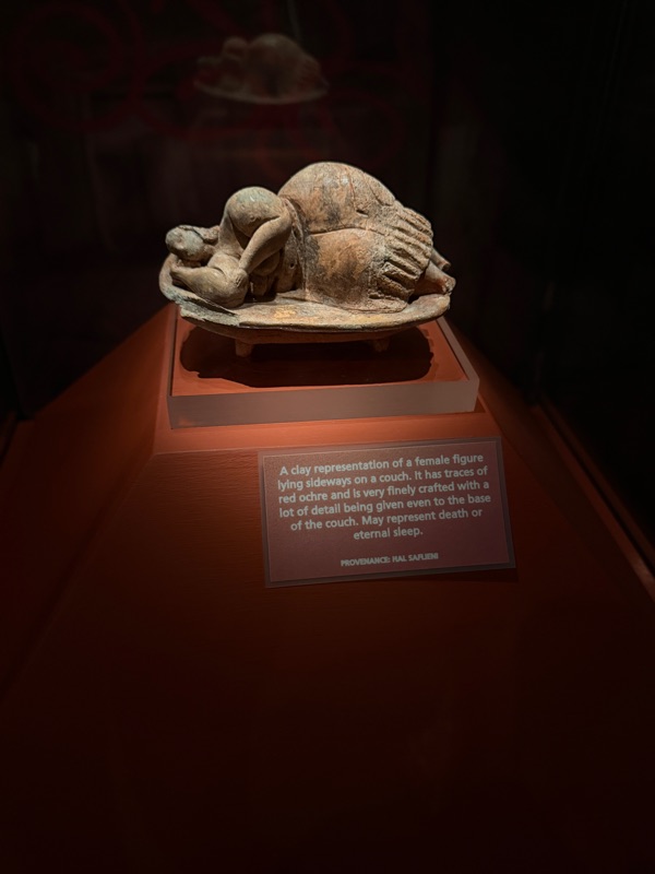 After walking around we found the Archeological Museum and we also met a couple who had been on the cruise. The museum contained many artifacts found at the Hypogeum and well as displays on the different ages of the ancient world ending with the Phoenician’s who were also known as Canaanites! Two figures from the Hypogeum were a sleeping lady and another very large statue of a woman.