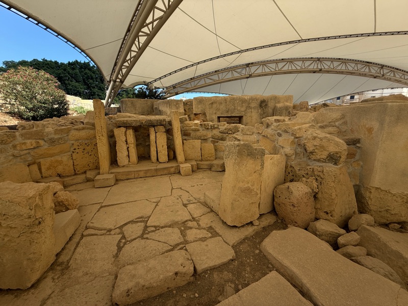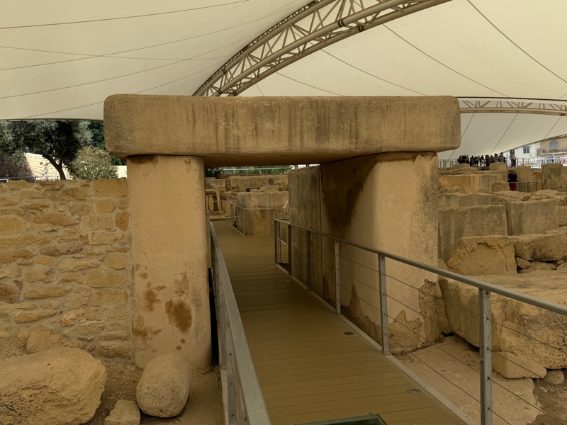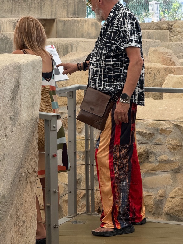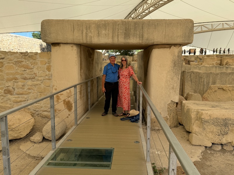 After having breakfast at our hotel we packed the suitcases and stored them with the receptionist. We decided to take the bus into Paola, the city where the Hypogeum was located. Apparently there is another site in Paola which is worth seeing. These are called the Taxien Temples. We spent about an hour reading all the info and touring the site. Marija asked that I take a photo of a rather unusually dressed couple. What do you think? Tim promised that he would never buy pants like that. We also walked through a very interesting graveyard and then took the trusty bus back to Marsaxlokk. We were hungry so found a restaurant that would make us a full English breakfast. We hung around until our driver was scheduled to arrive. He drove us to the ferry where we boarded at about 5:00 p.m. Tim had purchased first-class seats which meant that our luggage was tagged VIP and we had seats on the upper floor. However, people on the cruise had the same plans but were originally taking an earlier ferry. They rescheduled the ferry so we could visit on the trip over so we went downstairs and talked with them. They were from Toronto and had been doing puzzles with Marija.