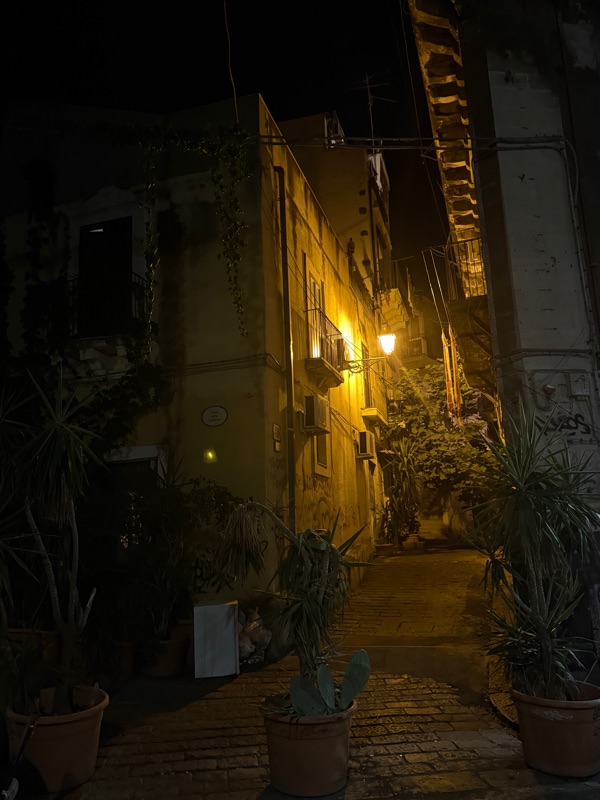 When we arrived at Pazzano in the south of Sicily we were met by a driver holding up a sign which said “TIMOTHY”. He deposited our luggage in a lovely Mercedes Benz and drove on the Autostrada to Catania - at 140 - 160 km for much of the trip! We arrived in Catania and spent over an hour trying to find our accommodation. In the evenings many of the streets are claimed by the restaurants as they put out table and vehicles cannot get down many of the streets. We drove around and around, he had to back out of a couple of situations and was getting quite frustrated. We both had the location on our GPS but he just could not get there. He kept stopping people and asking if they lived in Catania but most didn’t. Finally, he talked to two young men who had heard of the Palazzu Stidda. The driver said that we would need to walk to it and he promptly took our bags out of the trunk and said good-bye!!! It was dark, we had no idea where we were but these two young men said they would take us there and they offered to pull our bags. (This could have gone very badly.) They took us right to the gate and we thanked them and gave them a tip.