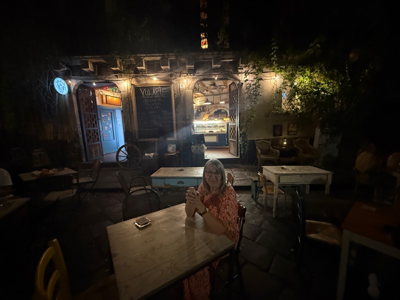 Tim used the code to get us in the gate, then he used another code to get us in the front door. Then we located the door keys and hauled our suitcases upstairs. We then went to the restaurant under our window to have dinner. We were in and we were safe!!!
